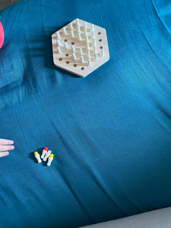 Les couleurs sous les pions rendent le jeu vraiment intéressant. Ça demande de bien se concentrer, c’est top.
