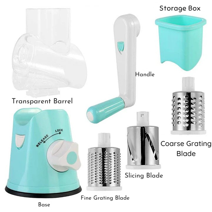 Produkten innehåller tre utbytbara blad: ett för att skiva, ett för att riva fint, och ett för att riva grovt.